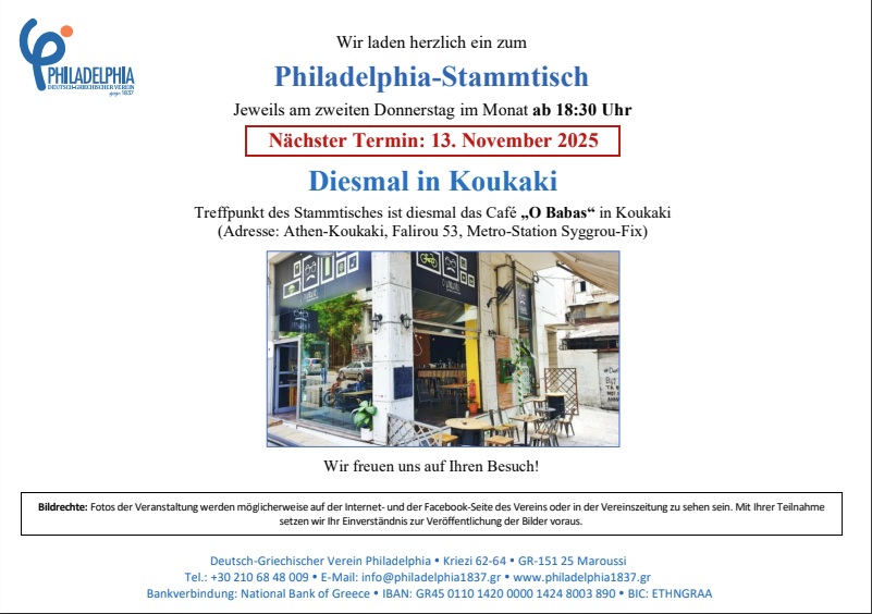 Philadelphia-Stammtisch am 13.11.2025 in Koukaki Einladung zum Philadelphia-Stammtisch am 13. November 2025 ab 18.30 Uhr im Café „O Babas“ in Koukaki.