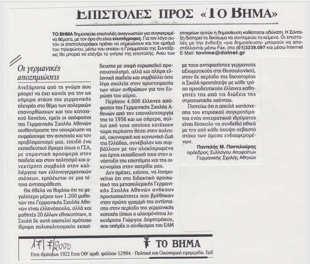 Ο Παντελής Παντελούρης, πρώην Πρόεδρος του Συλλόγου Αποφοίτων και διπλωματικός το 2000, που υπηρετούσε στην Αθήνα και ήταν ήδη από το 1998 πρόεδρος του Συλλόγου. Την περίοδο εκείνη δέσποζε στον τύπο το θέμα των γερμανικών αποζημιώσεων και η απαίτηση για κατάσχεση γερμανικών περιουσιακών στοιχείων όπως το κτίριο του Ινστιτούτου Γκαίτε και η Γερμανική Σχολή. Έστειλε τότε μία επιστολή, την οποία δημοσίευσαν η Καθημερινή, Το ΒΗΜΑ και η Ελευθεροτυπία.