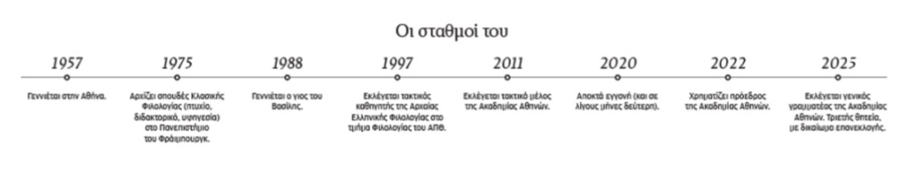 Τακτικό μέλος της Ακαδημίας Αθηνών έγινε πολύ νέος, 50άρης. Στη συνέχεια, πρόεδρος και αντιπρόεδρος. Αυτή τη στιγμή επιχειρεί με την αρμοδιότητα του γενικού γραμματέα, την ισχυρότερη στο Ιδρυμα, να φέρει έναν νέο αέρα εξωστρέφειας. Πολύ ικανός στα διοικητικά, ξεκίνησε τον εκσυγχρονισμό του κορυφαίου πνευματικού θεσμού την περίοδο που διετέλεσε πρόεδρός του, το 2022, με την ανανέωση του… 100ετούς Οργανισμού της Ακαδημίας (ολοκλήρωσε τον νέο νόμο το 2023, με τον «εξέχοντα νομικό Μιχάλη Σταθόπουλο που είχα την τύχη να με διαδεχθεί»), και με την προκήρυξη 19 νέων εδρών.
