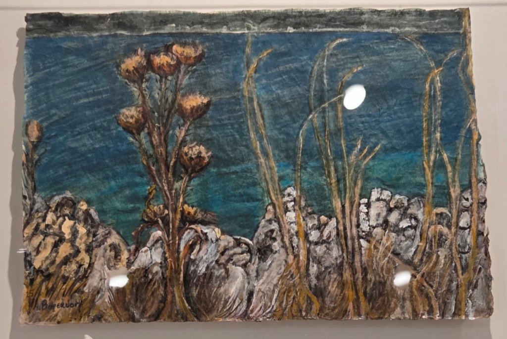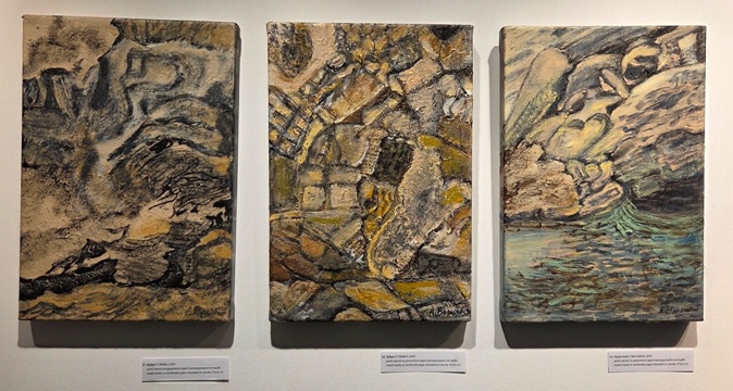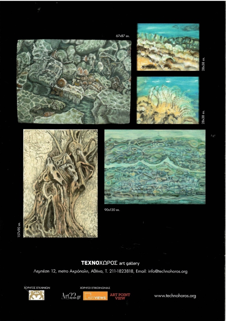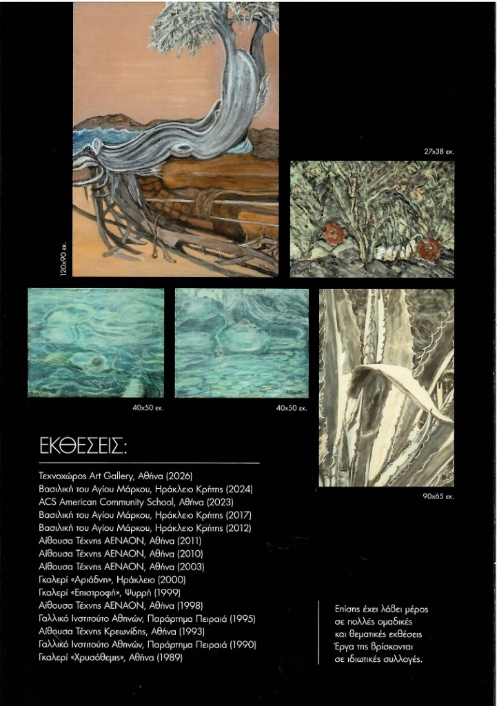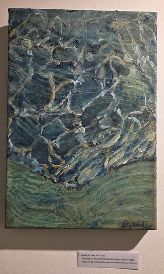 Η θάλασσα, τα βράχια, τα άνθη, ο βυθός είναι τα θέματα, που την εμπνέουν και παρουσιάζονται στην έκθεση, όλα έργα, που φιλοτεχνήθηκαν το 2025.