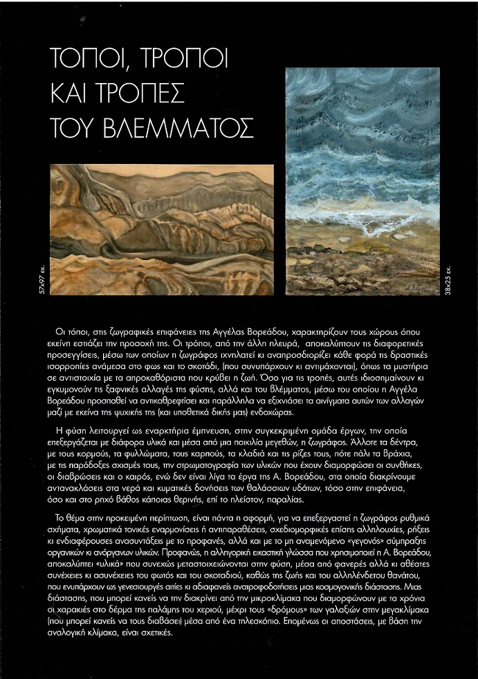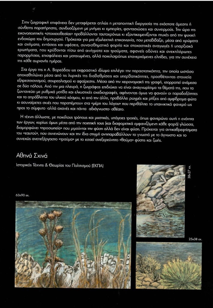 Η Αθηνά Σχινά, Ιστορικός Τέχνης & Θεωρίας του Πολιτισμού (ΕΚΠΑ) συνοδεύει τον κατάλογο της έκθεσης με μία ανάλυση προσεγγίζοντας τα έργα μέσα από το βλέμμα της ζωγράφου με τίτλο: “Τόποι, τρόποι και τροπές του βλέμματος“.