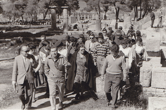 Ο Άλφρεντ Μάλβιτς ξεναγεί μια ομάδα μαθητών της Γερμανικής Σχολής Αθηνών στην Άλτη της Ολυμπίας. Σε πρώτο πλάνο από αριστερά: Ιδομενέας Παπαδάκης, Alfred Mallwitz, Maria DiLernia και πίσω αριστερά ξεχωρίζει το κεφάλι του Bernhard Greve.