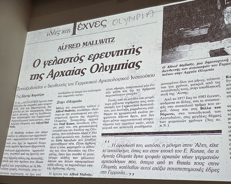 Το έργο του Alfred Mallwitz παρουσίασαν η Charlotte Schwarzer εκ μέρους της Πρεσβείας, ο Marc-André Schmachtel εκ μέρους του Goethe-Institut Athen και η Katja Sporn, Διευθύντρια του DAI Athen, η οποία είχε μαζί με τον Detlef την επιμέλεια της έκθεσης.