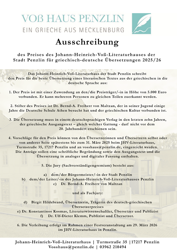 Το 2023 απονεμήθηκε για πρώτη φορά το βραβείο Johann Heinrich Voß, το οποίο δημιουργήθηκε από τον συμμαθητή μας Bernd v.Maltzan και είχαμε αναρτήσει στο site μας και στο “montags”. Ο Ulf-Dieter Klemm, που ζει στο Βερολίνο, εντόπισε την προκήρυξη του εφετινού διαγωνισμού και μας την έστειλε και η ημερομηνία υποβολής μεταφράσεων λήγει στις 31 Μαρτίου 2025.