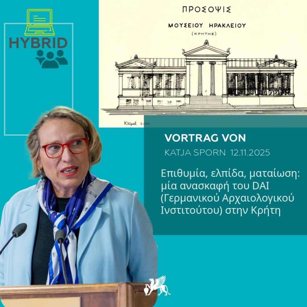 Am Mittwoch, den 12. November 2025 hält die Leitende Direktorin des DAI, Katja Sporn, einen Vortrag (auf Griechisch) mit dem Titel „Επιθυμία, ελπίδα, ματαίωση: μία ανασκαφή του DAI (Γερμανικού Αρχαιολογικού Ινστιτούτου) στην Κρήτη“ (dt.: „Wunsch, Hoffnung, Enttäuschung: eine Ausgrabung des DAI (Deutsches Archäologisches Institut) auf Kreta“). Die Veranstaltung findet im Rahmen der Ausstellung „ΕΚΑΤΟΜΠΟΛΙΣ: Ο Κόσμος της Αρχαϊκής Κρήτης“ (dt. „EKATOMPOLIS: Die Welt des antiken Kreta“) statt.