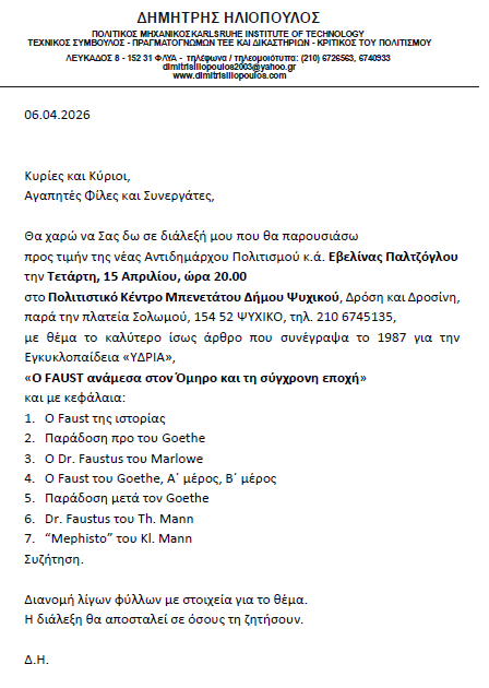 Ο Δημήτρης Ηλιόπουλος προσκαλεί την Τετάρτη 15 Απριλίου 2026 στις 20.00 σε διάλεξη στο Πολιτιστικό Κέντρο Μπενετάτου Δήμου Ψυχικού (Δρόση και Δροσίνη – πλατεία Σολωμού) με θέμα: