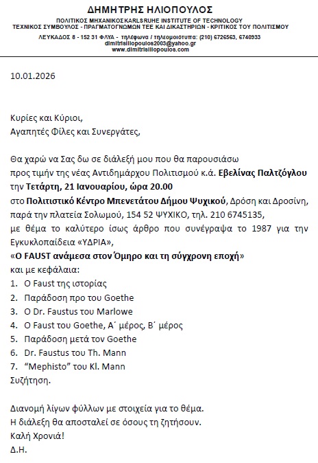 Ο Δημήτρης Ηλιόπουλος προσκαλεί στις 21 Ιανουαρίου 2026 στις 20.00 σε διάλεξη στο Πολιτιστικό Κέντρο Μπενετάτου Δήμου Ψυχικού (Δρόση και Δροσίνη – πλατεία Σολωμού) με θέμα: