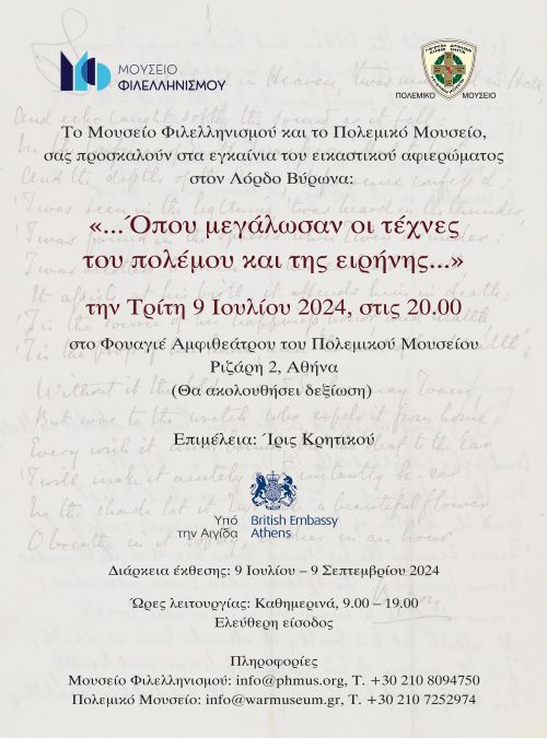Το Μουσείο Φιλελληνισμού και το Πολεμικό Μουσείο, στο πλαίσιο του έτους «2024, Έτος Λόρδου Βύρωνα και Φιλελληνισμού», συνδιοργανώνουν μία σημαντική ομαδική έκθεση με τη συμμετοχή 50 σύγχρονων Ελλήνων εικαστικών με τίτλο: «… Όπου μεγάλωσαν οι τέχνες του πολέμου και της ειρήνης…».