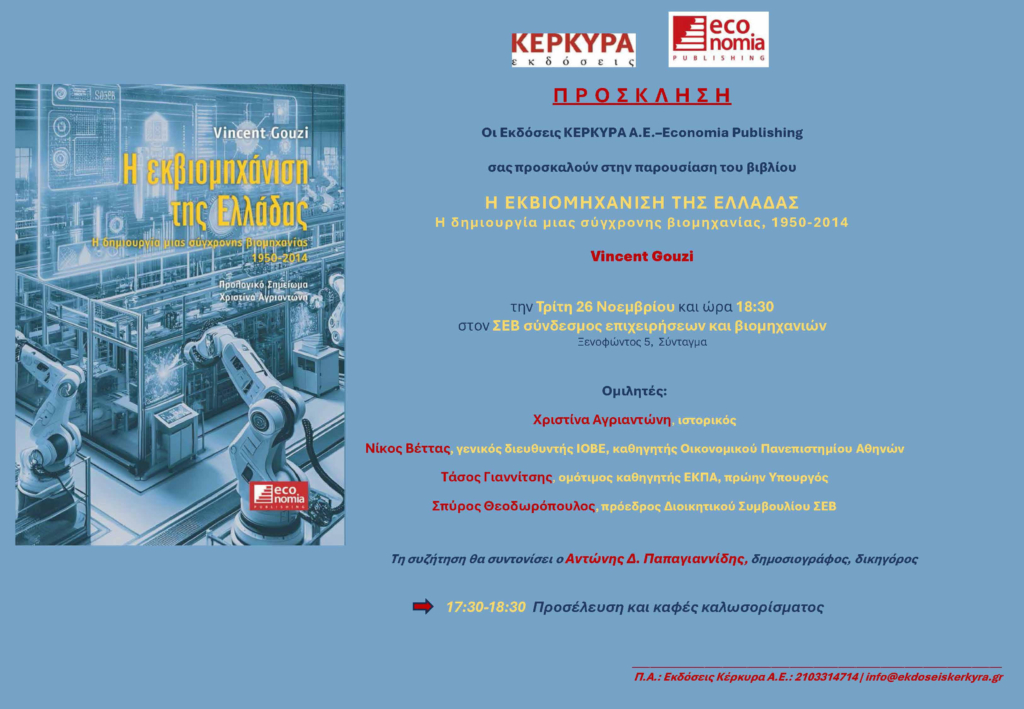 Οι Εκδόσεις Κέρκυρα και η εκδότρια, Αλεξάνδρα Κ. Βοβολίνη, προσκαλούν στην παρουσίαση του βιβλίου: “Η ΕΚΒΙΟΜΗΧΑΝΙΣΗ ΤΗΣ ΕΛΛΑΔΑΣ”, ΤΟΥ VINCENT GOUZI