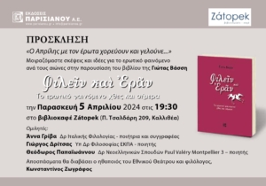 Οι εκδόσεις Παρισιάνου παρουσίαζουν την Παρασκευή 5 Απριλίου στις 19:30 στο βιβλιοκαφέ Zatopek το βιβλίο της Γιώτας Βάσση “Φιλείν και Εράν”.