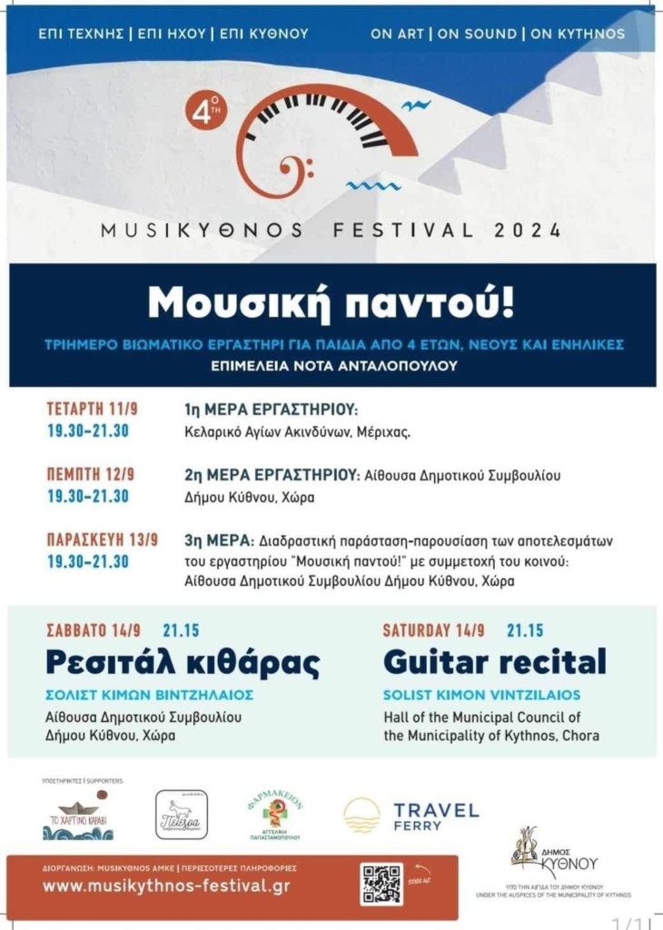 Οι φετινές εκδηλώσεις έχουν τον τίτλο “Μουσική παντού” και είναι ένα τριήμερο βιωματικό εργαστήρι για παιδιά από 4 ετών, νέους και ενήλικες (επιμέλεια: Νότα Ανταλοπούλου). Μια δράση σχεδιασμένη κυρίως για τα παιδιά, τους νέους και τους ανθρώπους που ζουν στο νησί ανοιχτή και για κάθε επισκέπτη που μπορεί να βρίσκεται στην Κύθνο και έχει την διάθεση να συμμετέχει. Οι συμμετέχοντες στο βιωματικό εργαστήρι θα ζήσουν ένα τριήμερο όπου θα παίξουν με τους ρυθμούς και τις μελωδίες, θα μοιραστούν εμπειρίες μέσα από μουσικοκινητικά παιχνίδια, θα συνεργαστούν, θα γνωρίσουν διάφορα ήδη μουσικής, θα μάθουν ιστορικές πληροφορίες για τις εποχές, τους συνθέτες, τα διάφορα μουσικά όργανα, θα γίνουν οι ίδιοι μέλη μιας ορχήστρας με τη χρήση μελωδικών και ρυθμικών κρουστών τύπου Orff.