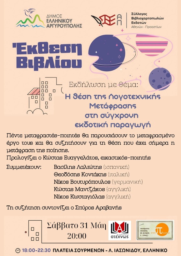 Η Επιθεώρηση Ποιητικής Τέχνης ΠΟΙΕΙΝ και οι εκδόσεις Ατέχνως στο πλαίσιο της 2ης Έκθεσης Βιβλίου που διοργανώνει στην πλατεία Σουρμένων ο Σύλλογος Βιβλιοχαρτοπωλών και Εκδοτών Αθηνών – Προαστίων σε συνεργασία με το Δήμο Ελληνικού Αργυρούπολης και τη στήριξη της Πανελλήνιας Ομοσπονδίας Εκδοτών Βιβλιοχαρτοπωλών, διοργανώνουν εκδήλωση με θέμα: