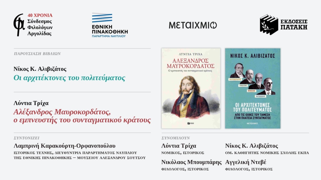 Η νομικός και ιστορικός Λύντια Βελισσαρίου-Τρίχα παρουσιάζει το βιβλίο της: “Αλέξανδρος Μαυροκορδάτος – Ο εμπνευστής του συνταγματικού κράτους“ στην Εθνική Πινακοθήκη – Μουσείο Αλέξανδρου Σούτσου (παράρτημα Ναυπλίου) το Σάββατο 18 Οκτωβρίου και ώρα 7:00 μ.μ.