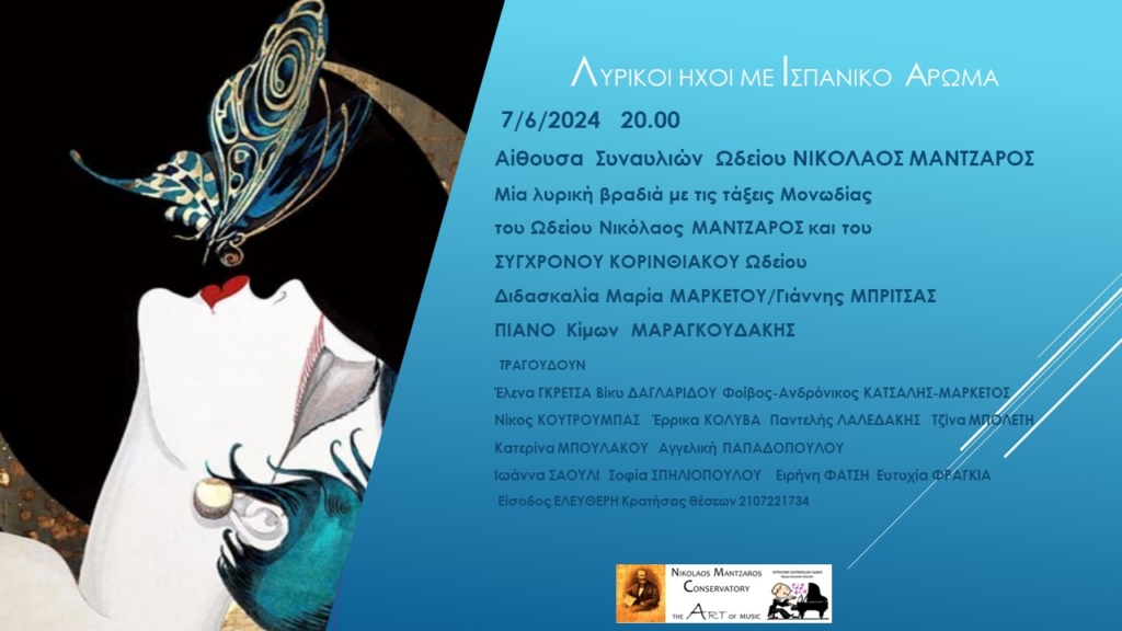 Η μεσόφωνος και καθηγήτρια του Ωδείου “Νικόλαος Μάντζαρος” Μαρία Μαρκέτου (’71) στη διδασκαλία, ο τενόρος Νίκος Κουτρουμπάς (’63) και ο πιανίστας Κίμων Μαραγκουδάκης (’81), συμμετέχουν σε λυρική βραδιά με τις τάξεις Μονωδίας του Σύγχρονου Κορινθιακού Ωδείου και του Ωδείου Νικόλαος Μάντζαρος.