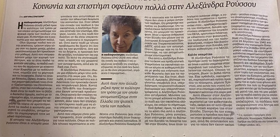 Ο Αργύρης Στριγγάρης, Καθηγητής Ψυχιατρικής Παιδιών και Εφήβων στο ΕΚΠΑ και στο University College London (UCL), δημοσίευσε στην Καθημερινή της 16/6/2024 άρθρο για την επιφανή παιδοψυχίατρο Αλεξάνδρα Ρούσσου, που έφυγε από τη ζωή τον περασμένο Μάιο. Ήταν η πρώτη επιστήμων στην Ελλάδα που μίλησε για τη Διαταραχή Ελλειματικής Προσοχής και Υπερκινητικότητας (ΔΕΠΥ) αλλά και για τον αυτισμό.