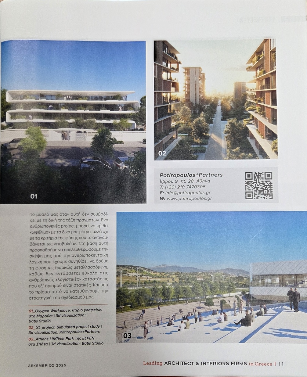 Στο αφιέρωμα “Leading ARCHITECTS + INTTERIORS FIRMS in Greece” της εφημερίδας “Το ΒΗΜΑ” της Κυριακής 14 Δεκεμβρίου 2025 έδωσε ο Δημήτης Ποτηρόπουλος μία συνέντευξη με τίτλο: