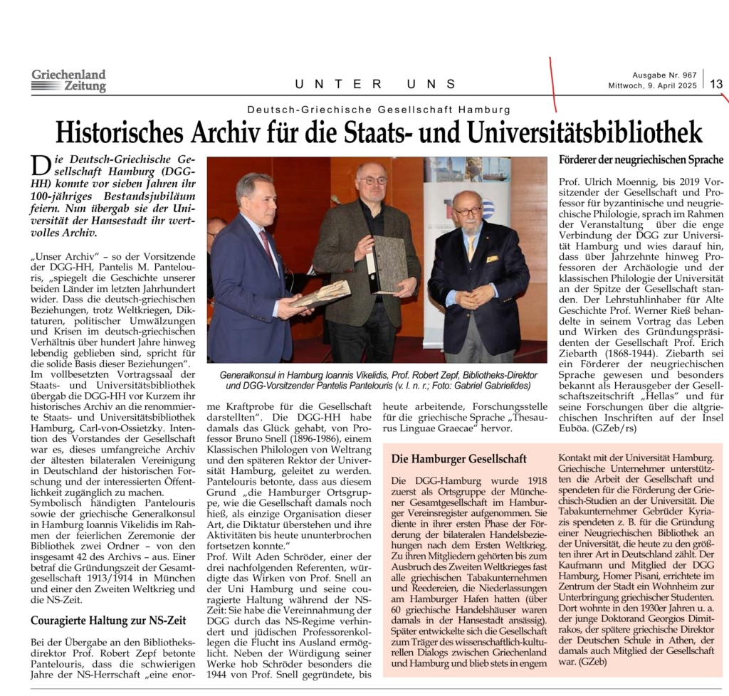 Η DGG-HH γιόρτασε πριν από 7 χρόνια τα 100 χρόνια από την ίδρυσή της και πριν λίγες ημέρες παρέδωσε το Αρχείο της στο Πανεπιστήμιο του Δήμου του Αμβούργου.