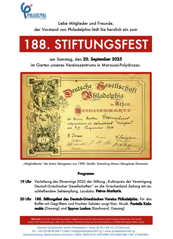 Ο Ελληνογερμανικός Σύλλογος Philadelphia προσκαλεί τα μέλη και τους φίλους του στο 188. Stiftungsfest με μία κάρτα μέλους από το 1900 του Anton Steingaesser, από το αρχείο του Μάνου Στάγγεσερ (Steingaesser) Διαμαντή.