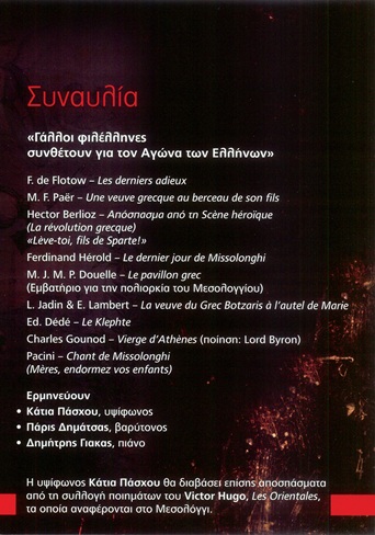 Στο πλαίσιο της εκδήλωσης δόθηκε συναυλία με τίτλο: “Γάλλοι φιλέλληνες συνθέτουν για τον Αγώνα των Ελλήνων” όπου στο πιάνο ήταν ο Δημήτρης Γιάκας.