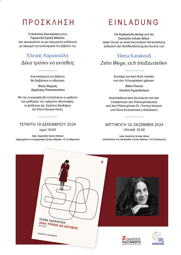 Οι Εκδόσεις Καστανιώτη και η Γερμανική Σχολή Αθηνών προσκαλούν σε μία ξεχωριστή εκδήλωση με αφορμή την κυκλοφορία της του βιβλίου ‘Ελενας Καρακούλη “Δέκα τρόποι να εκτεθείς”