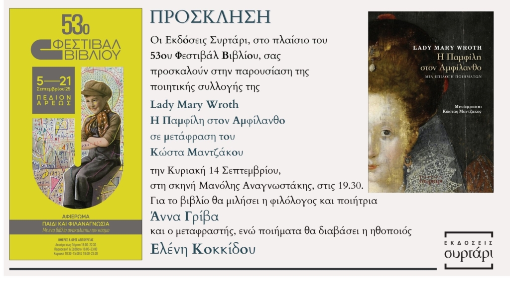 Την Κυριακή 14 Σεπτεμβρίου και παρουσίασε ο Κώστας Μαντζάκος στο 23ο Φεστιβάλ Βιβλίου, στο Πεδίο του Άρεως / Σκηνή Μανώλη Αναγνωστάκη, τη μετάφρασή του από το έργο της Lady Mary Wroth ”Η Παμφίλη στον Αμφίλανθο”