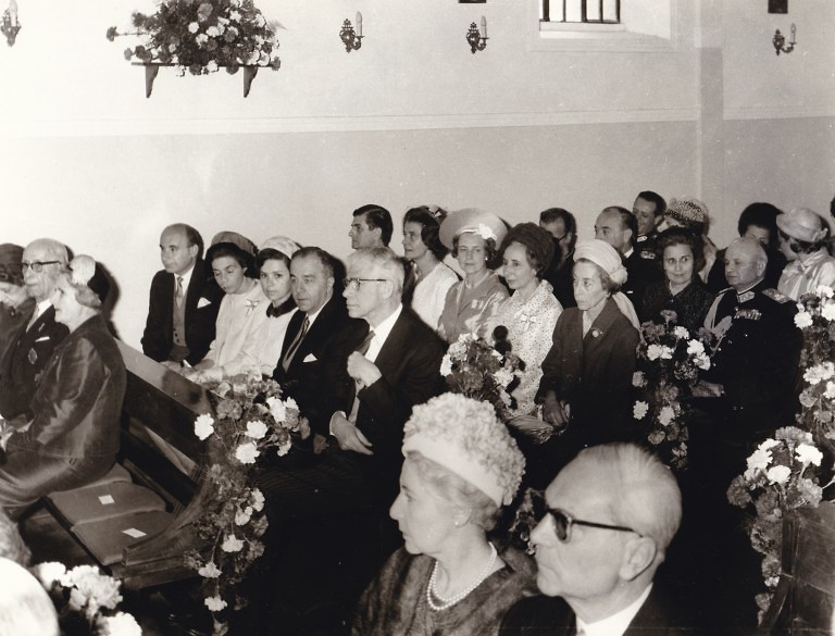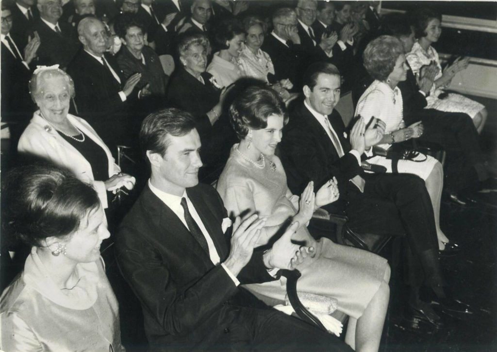 Αριστερά, η κυρία Λελούδα και δίπλα ο σύζυγός της Παύλος Λελούδας, Αυλάρχης της Βασίλισσας-Μητέρας Φρειδερίκης. Αμέσως μετά (σε πρώτο πλάνο) η κυρία Παπαθανασιάδη, σύζυγος του Αυλάρχη του Βασιλέως στρατηγού Θεοδοσίου Παπαθανασιάδη, για τον οποίο προορίζεται η κενή θέση δίπλα της. Ο Αυλάρχης περιμένει στην καγκελόπορτα να υποδεχτεί τους Βασιλείς. Η άλλη κενή θέση προορίζεται για την Μεγάλη Κυρία της Αυλής, την Μαίρη Καρόλου, που φτάνει πάντα μαζί με τους Βασιλείς. Στην επόμενη σειρά, αριστερά ο Γεώργιος Κορυζής, γιος του πρωθυπουργού Αλέξανδρου Κορυζή που στα 1941, με την είσοδο των Γερμανών στην Ελλάδα, αυτοκτόνησε. Εδώ βρίσκεται συνοδεύοντας την σύζυγό του, που κάθεται δίπλα του. Η Φρόσω Κορυζή (κόρη του Βολιώτη βιομηχάνου Βάγγου Γκλαβάνη, που εκτέλεσαν οι κομμουνιστές στον εμφύλιο) είναι η Κυρία επί των Τιμών της Άννας-Μαρίας, που εκείνη την εποχή την συνόδευε παντού και πάντα. Δίπλα της, η άλλη Κυρία επί των Τιμών της Άννας-Μαρίας, η κυρία Βελισσαροπούλου με τον σύζυγό της. Επόμενος στην σειρά ο Αυλάρχης της Βασίλισσας, Υποναύαρχος Δημήτριος Τσάφος. Στην επόμενη σειρά, ο Αρχηγός του Γραφείου του Βασιλέως Δημήτριος Μπίτσιος και η σύζυγός του. Μετά οι δυο πιστές Κυρίες επί των Τιμών της Βασίλισσας Φρειδερίκης, αριστερά η δεσποινίς Κορυζή (η κόρη του αυτόχειρα πρωθυπουργού) και δεξιά η δεσποινίς Παπαρρηγοπούλου (η κόρη του Ναυάρχου Στέφανου Παπαρρηγόπουλου).