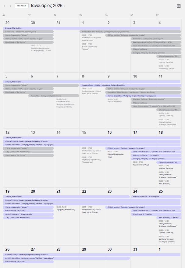 Μία ματιά στο ΗΜΕΡΟΛΟΓΙΟ του Ιανουαρίου αποκαλύπτει ότι είναι γεμάτο από εκδηλώσεις αποφοίτων. Είχαμε αναφέρει ότι έχουμε 20 θεατρικές παραστάσεις στην εφετινή σεζόν, πολλές παρουσιάσεις και εκδόσεις βιβλίων, εκθέσεις, ομιλίες και έπονται και άλλα. Ούτε μία ημέρα δεν υπάρχει “ελεύθερη” μέσα στον Ιανουάριο.
