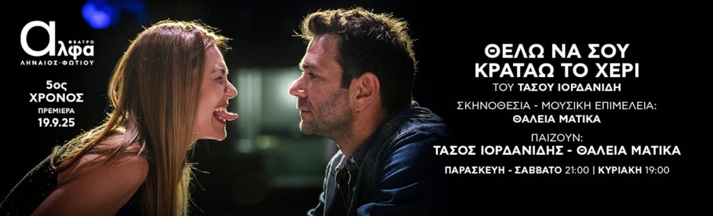 Θέλω να σου κρατάω το χέρι» του Τάσου Ιορδανίδη για 5ο χρόνο στο θέατρο Άλφα σε σκηνοθεσία και μουσική επιμέλεια Θάλειας Ματίκα. Παίζουν ο Τάσος Ιορδανίδης και η Θάλεια Ματίκα.