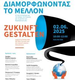 Πρόσκληση στην εκδήλωση- συζήτηση με θέμα: «Διαμορφώνοντας το μέλλον: Οι νέοι σε διάλογο για τον κόσμο, την Ευρώπη και το μέλλον των δημοκρατιών μας», Δευτέρα 2 Ιουνίου 2025 και ώρα: 10:00-12:00 στην Αίθουσα Εκδηλώσεων Γερμανικής Σχολής Αθηνών