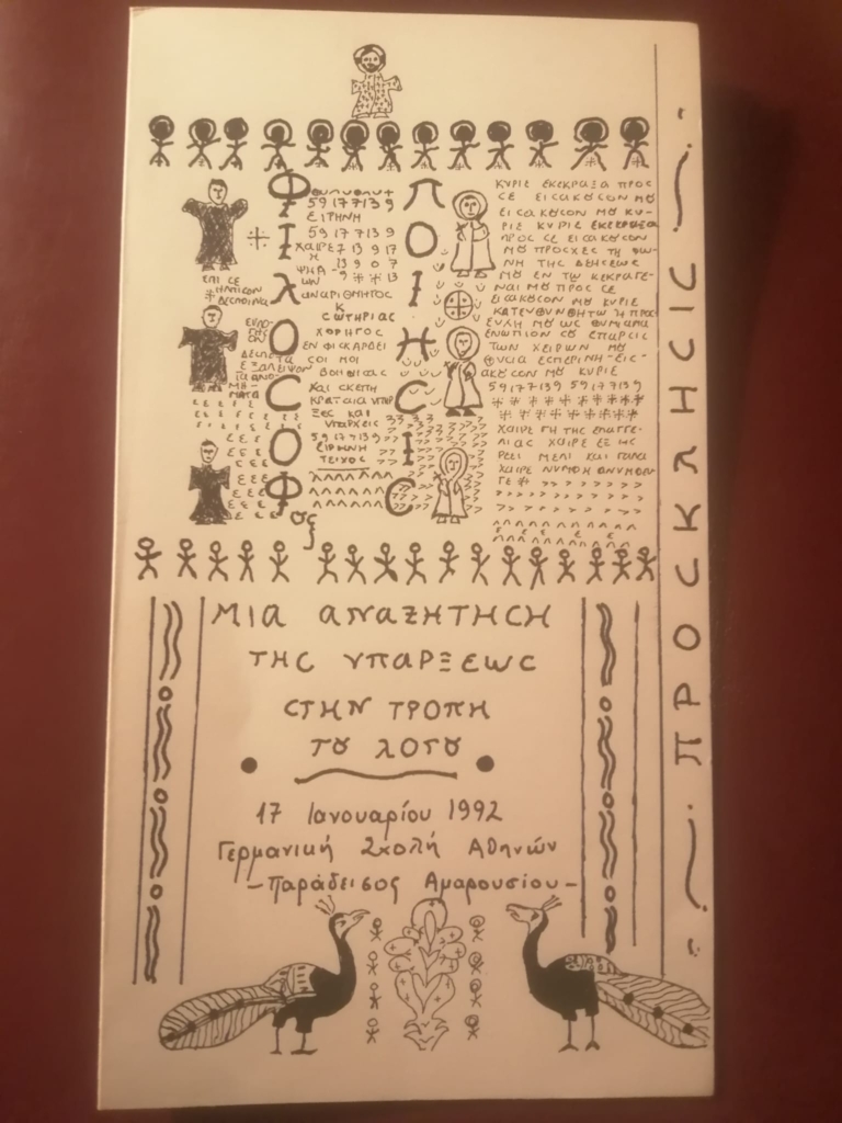 Η χειρόγραφη πρόσκληση ήταν έργο του Αργύρη Στριγγάρη στο πνεύμα του Ν. Γ. Πεντζίκη.»