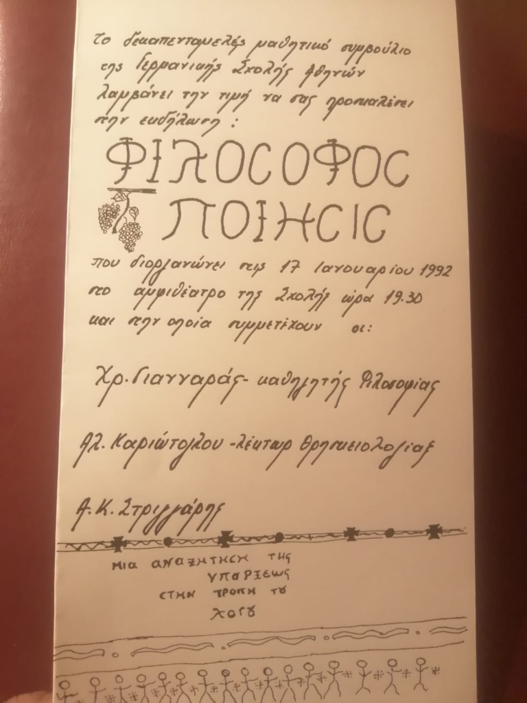 Ο Άρης Μπίρταχας, Καθηγητής θεολόγος στην DSA, θυμάται την μαθητική εκδήλωση με τη συμμετοχή του Χρήστου Γιανναρά με μία ανάρτησή του στη σελίδα DSA Ein online Jahrbuch στο fb (Ο Χρήστος Γιανναράς που απεβίωσε στις 24 Αυγούστου 2024 ήταν σύγχρονος Έλληνας καθηγητής φιλοσοφίας και συγγραφέας):