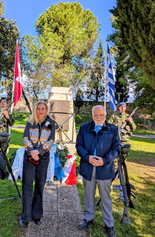 Ο Κώστας Παπαηλιού με την Μαρία Αντωνιάδου, Πρόεδρο της ΕΣΗΕΑ μπροστά από το μνημείο του Μάγερ στον κήπο των Ηρώων στο Μεσολόγγι κατά τον εορτασμό των 200 ετών της Εξόδου