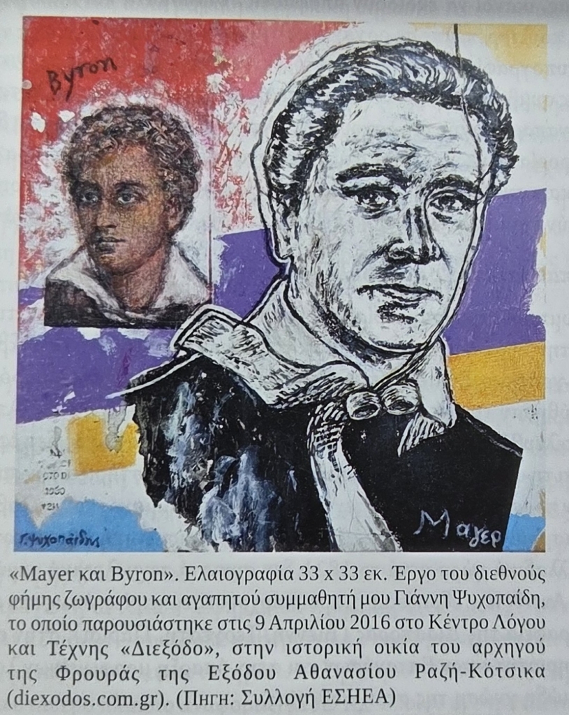 Στην σελίδα 97 υπάρχει αναφορά στον Γιάννη Ψυχοπαίδη για την ελαιογραφία του “Mayer και Byron”