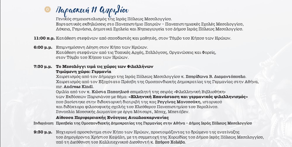 Την Παρασκευή 11 Απριλίου στις 7.30 το πρόγραμμα με τίτλο “Το Μεσολόγγι τιμά τις χώρες των Φιλελλήνων” και Τιμώμενη χώρα την Γερμανία, περιλαμβάνει: