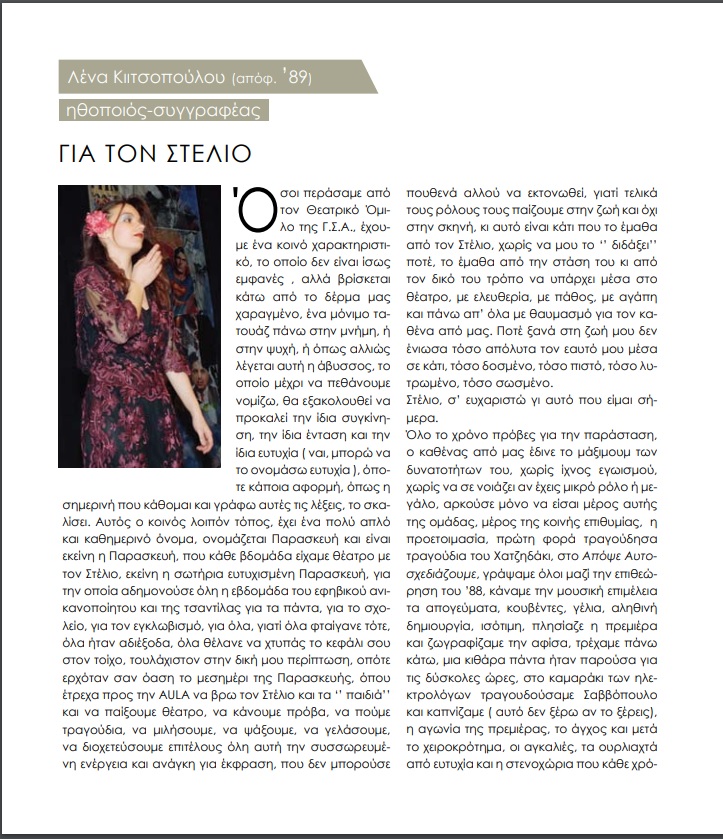 Όσοι περάσαμε από τον Θεατρικό Όμιλο της Γ.Σ.Α., έχουμε ένα κοινό χαρακτηριστικό, το οποίο δεν είναι ίσως εμφανές , αλλά βρίσκεται κάτω από το δέρμα μας χαραγμένο, ένα μόνιμο τατουάζ πάνω στην μνήμη, ή στην ψυχή, ή όπως αλλιώς λέγεται αυτή η άβυσσος, το οποίο μέχρι να πεθάνουμε νομίζω, θα εξακολουθεί να προκαλεί την ίδια συγκίνηση, την ίδια ένταση και την ίδια ευτυχία (ναι, μπορώ να το ονομάσω ευτυχία), όποτε κάποια αφορμή, όπως η σημερινή που κάθομαι και γράφω αυτές τις λέξεις, το σκαλίσει. Αυτός ο κοινός λοιπόν τόπος, έχει ένα πολύ απλό και καθημερινό όνομα, ονομάζεται Παρασκευή και είναι εκείνη η Παρασκευή, που κάθε βδομάδα είχαμε θέατρο με τον Στέλιο, εκείνη η σωτήρια ευτυχισμένη Παρασκευή, για την οποία αδημονούσε όλη η εβδομάδα του εφηβικού ανικανοποίητου και της τσαντίλας για τα πάντα, για το σχολείο, για τον εγκλωβισμό, για όλα, γιατί όλα φταίγανε τότε, όλα ήταν αδιέξοδα, όλα θέλανε να χτυπάς το κεφάλι σου στον τοίχο, τουλάχιστον στην δική μου περίπτωση, οπότε ερχόταν σαν όαση το μεσημέρι της Παρασκευής, όπου έτρεχα προς την AULA να βρω τον Στέλιο και τα ‘’ παιδιά’’ και να παίξουμε θέατρο, να κάνουμε πρόβα, να πούμε τραγούδια, να μιλήσουμε, να ψάξουμε, να γελάσουμε, να διοχετεύσουμε επιτέλους όλη αυτή την συσσωρευμένη ενέργεια και ανάγκη για έκφραση, που δεν μπορούσε πουθενά αλλού να εκτονωθεί, γιατί τελικά τους ρόλους τους παίζουμε στην ζωή και όχι στην σκηνή, κι αυτό είναι κάτι που το έμαθα από τον Στέλιο, χωρίς να μου το ‘’ διδάξει’’ ποτέ, το έμαθα από την στάση του κι από τον δικό του τρόπο να υπάρχει μέσα στο θέατρο, με ελευθερία, με πάθος, με αγάπη και πάνω απ’ όλα με θαυμασμό για τον καθένα από μας. Ποτέ ξανά στη ζωή μου δεν ένιωσα τόσο απόλυτα τον εαυτό μου μέσα σε κάτι, τόσο δοσμένο, τόσο πιστό, τόσο λυτρωμένο, τόσο σωσμένο.
