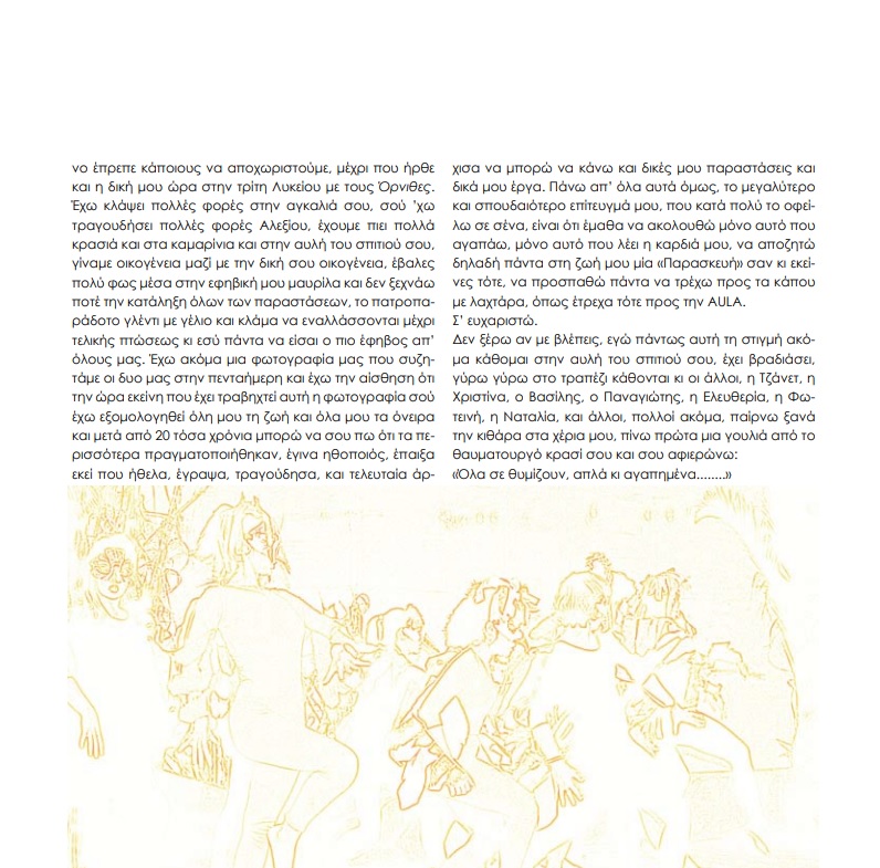 Πάνω απ’ όλα αυτά όμως, το μεγαλύτερο και σπουδαιότερο επίτευγμά μου, που κατά πολύ το οφείλω σε σένα, είναι ότι έμαθα να ακολουθώ μόνο αυτό που αγαπάω, μόνο αυτό που λέει η καρδιά μου, να αποζητώ δηλαδή πάντα στη ζωή μου μία «Παρασκευή» σαν κι εκείνες τότε, να προσπαθώ πάντα να τρέχω προς τα κάπου με λαχτάρα, όπως έτρεχα τότε προς την AULA. Σ’ ευχαριστώ. Δεν ξέρω αν με βλέπεις, εγώ πάντως αυτή τη στιγμή ακόμα κάθομαι στην αυλή του σπιτιού σου, έχει βραδιάσει, γύρω γύρω στο τραπέζι κάθονται κι οι άλλοι, η Τζάνετ, η Χριστίνα, ο Βασίλης, ο Παναγιώτης, η Ελευθερία, η Φωτεινή, η Ναταλία, και άλλοι, πολλοί ακόμα, παίρνω ξανά την κιθάρα στα χέρια μου, πίνω πρώτα μια γουλιά από το θαυματουργό κρασί σου και σου αφιερώνω: «Όλα σε θυμίζουν, απλά κι αγαπημένα……..»