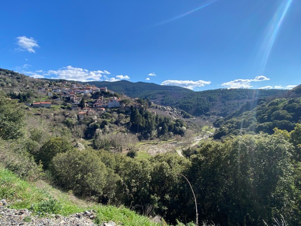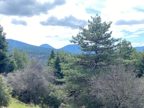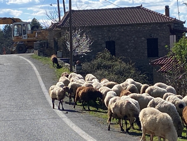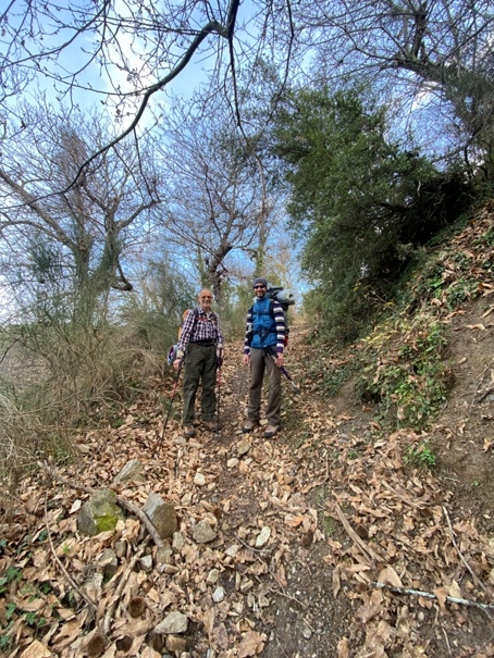 Παράξενο που το βαρύ σακίδιο δεν.. πολυβαραίνει. Λιακάδα και σύννεφα, ευχάριστα. Ανεβαίνουμε την ράχη Σκούλεβας πάνω από την Βαμβακού. Γρήγορα μου φάνηκε. Φωτογραφίες. Σύντομη κατάβαση στην ρεματιά στους Λόγγους: Όλα γνωστά. Πλατάνια γυμνά, καστανιές, πουρνάρια, ανθισμένες αμυγδαλιές.