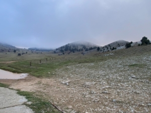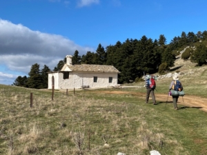 Κατά τις 15 η ώρα, φτάνουμε επιτέλους σε επίπεδο, άδενδρο τόπο με χαμηλό χόρτο. Μας πήρε πέντε ώρες, με φορτίο. Φυσάει. Σύννεφα. Κρύο. Ωραίο τοπίο με σήμανση για την τελική ανάβαση στην κορυφή Μεγάλη Τούρλα 1935μ. Προωθούμαστε μέχρι το βόρειο άκρο του Κάμπου όπου και ο Άγιος Ηλίας. Εκκλησάκι με μικρό προθάλαμο, στην άκρη του βόρειου δάσους που, κατηφορικά, οδηγεί στην Μονή Μαλεβής. Δεξιά μας τα πετρώδη, ομαλά, τελικά υψώματα του βουνού.