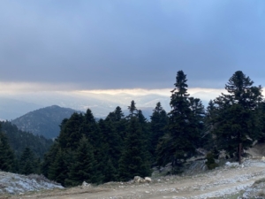 Από κει, μέσα σε δύο ώρες, φτάνουμε στο ορειβατικό καταφύγιο του Πάρνωνα. Θέση Αρνόμουσγα, υψόμετρο 1430μ. Ο καταφυγιάς μας χαιρετά και μας λέει που υπάρχει κοντινή πηγή. Παίρνουμε μονοπάτι μέσα σε θαυμάσιο δάσος ελάτων για τον Κάμπο στα 1660μ., ένα οροπέδιο ακριβώς κάτω από τις τρεις ψηλές κορυφές του Πάρνωνα. Είναι ήδη απόγευμα. Συναντάμε αρκετές ομάδες ορειβατών που ξεκίνησαν νωρίς και τώρα επιστρέφουν. Μας λένε ότι ψηλά φυσάει δυνατά με κρύο. Άλλοι αναφέρουν πως το ξωκλήσι του Αγίου Ηλία στον Κάμπο είναι ανοικτό. Συνεχίζουμε σε χωματόδρομο που σύντομα στενεύει σε μονοπάτι, συνεχώς ανηφορικά, μέσα σε ψηλά έλατα.