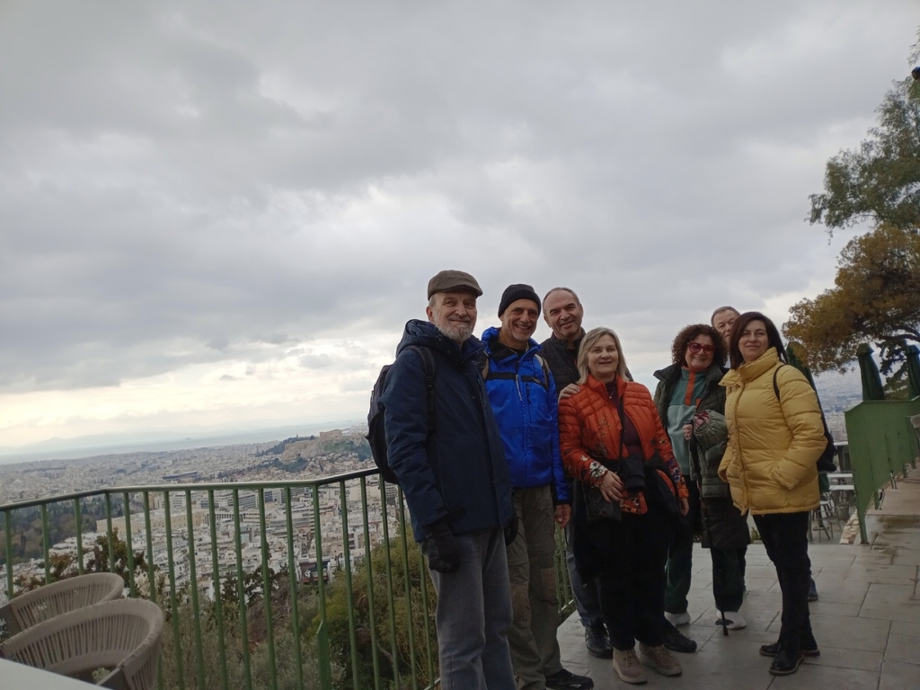 Βρεθήκαμε στο κέντρο, κοντά στον Ευαγγελισμό. Από εκεί Δεξαμενή, μετά ανηφόρα ως κορυφή τον Αη Γιώργη. Ψιλόβροχο, ο παπάς τραπέζωνε το εκκλησίασμα. Κατεβήκαμε προς το ανοιχτό θέατρο και νότια από αυτό. Μπήκαμε στην χαράδρα του Λυκαβηττού με κάποιες ορθοπλαγιές. Μικρό σκαρφάλωμα και νάμαστε πίσω στο πάρκινγκ του θεάτρου όπου υπερίπτατο ένα μοντέλο αεροπλανάκι.