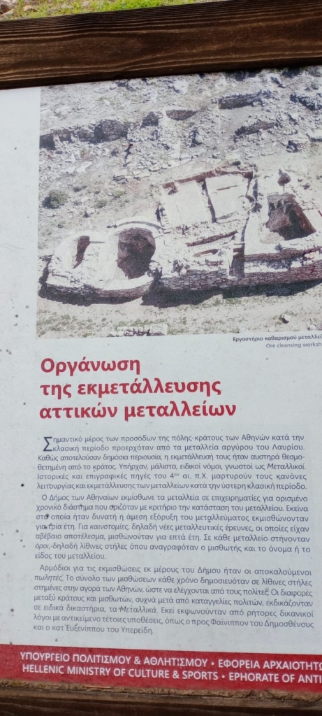 Περπατήσαμε γύρω γύρω με στάσεις για φωτογραφίες. Είπαμε και για την μεταλλευτική ιστορία του τόπου. Τον 4ο και 3ο αιώνα π.χ. η αρχαία Αθήνα είχε σημαντικό έσοδο από τον άργυρο και μόλυβδο της περιοχής. Με το ασήμι αυτό, ο Θεμιστοκλής έπεισε τους Αθηναίους να χτίσουν διακόσιες τριήρεις που ναυμάχισαν στην Σαλαμίνα λίγα χρόνια αργότερα. Οι δούλοι, σε απάνθρωπες συνθήκες, έσκαβαν σερνάμενοι σε οριζόντιες στοές ακολουθώντας την φλέβα μεταλλεύματος.