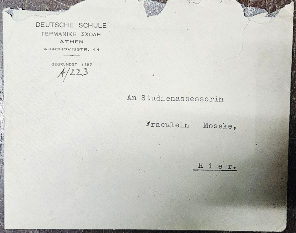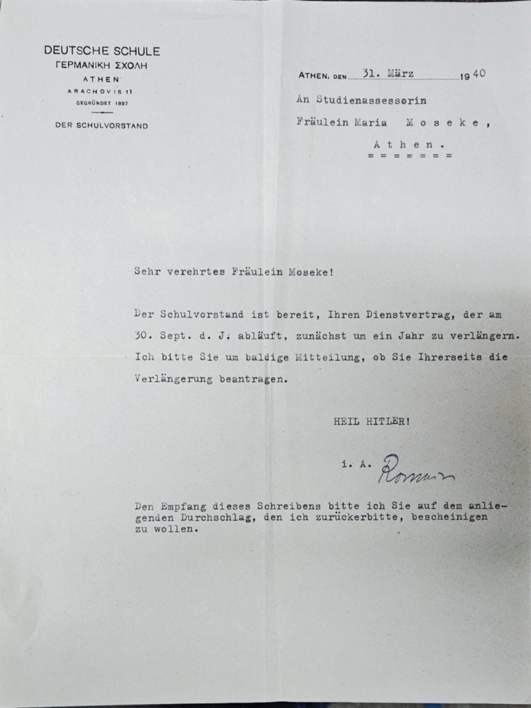 Επιστολή του Διευθυντή της Σχολής, Prf. Dr. Alfred Romain με ημερομηνία 31.3.1940 προς την δεσποινίδα Maria Moseke. Ο διευθυντής υπογράφει με τον χαιρετισμό: “Heil Hitler!”, όπως επεβάλλετο εκείνη την περίοδο.