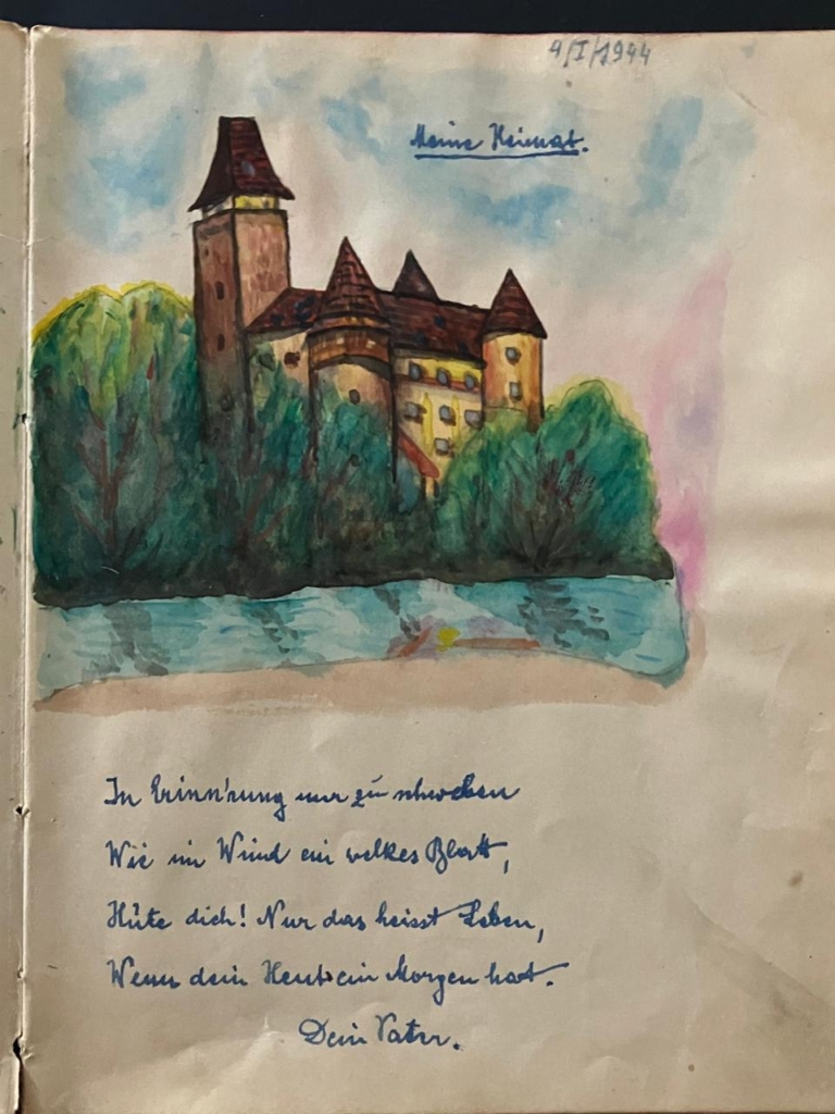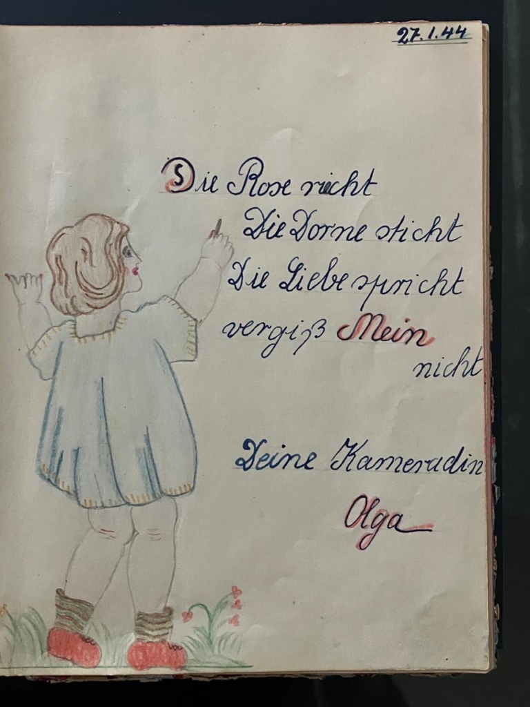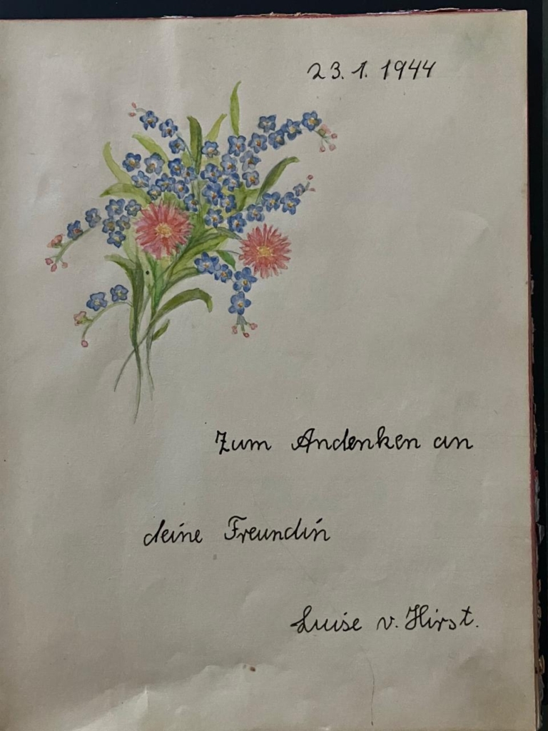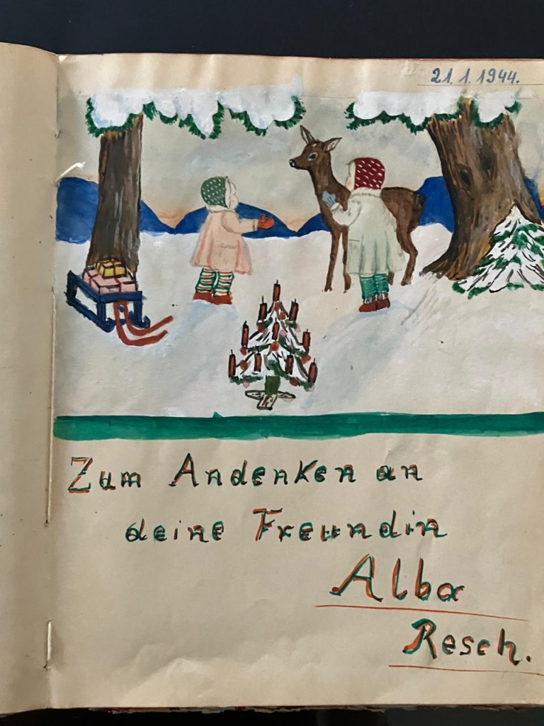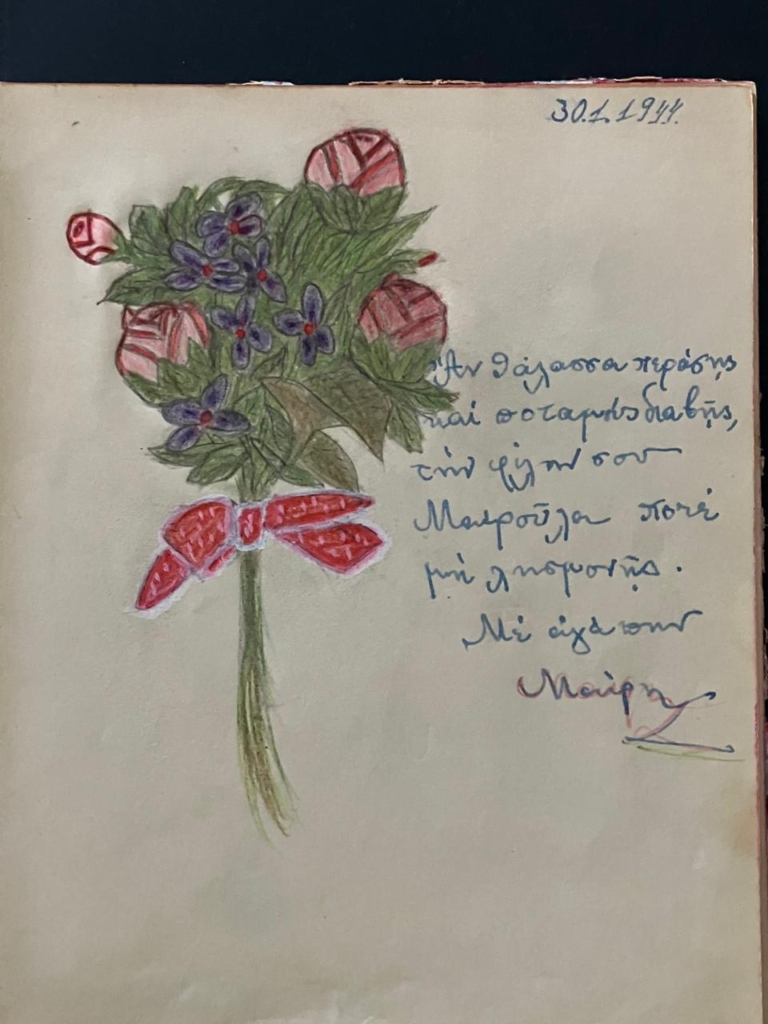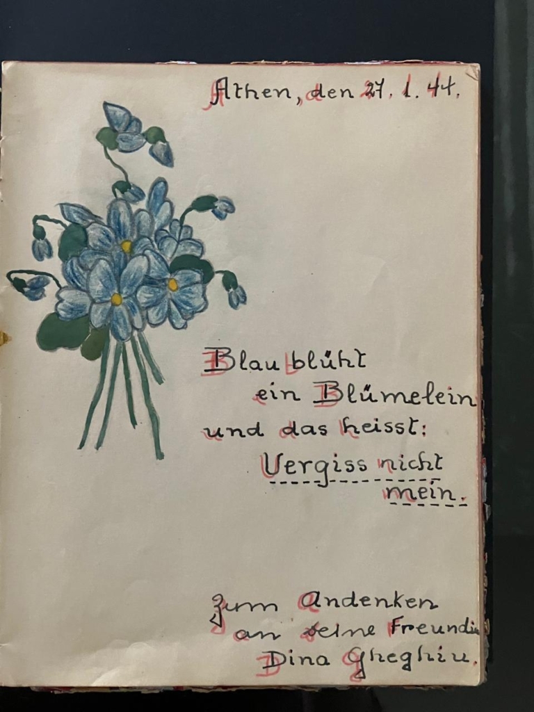 Η Greta Huck, μαθήτρια των χρόνων της Αραχώβης, ζήτησε από τις συμμαθήτριες και τους συμμαθητές της να ζωγραφίσουν και να υπογράψουν το λεύκωμά της λίγο πριν κλείσει η Σχολή το 1944.