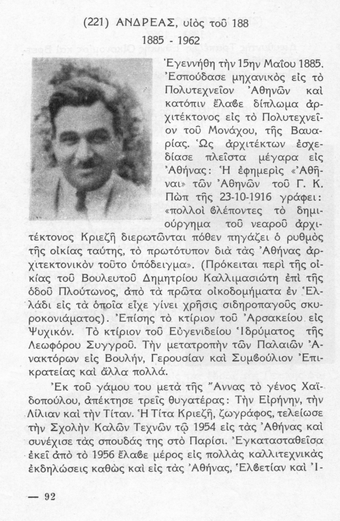 Ο Ανδρέας Κριεζής (1887 – 29 Ιουλίου 1962) γεννήθηκε στην Ύδρα, σπούδασε πολιτικός μηχανικός στο Εθνικό Μετσόβιο Πολυτεχνείο και αρχιτεκτονική στην Σχολή του Μονάχου. Υπήρξε ιδρυτικό μέλος και πρώτος πρόεδρος της Ελληνικής Αρχιτεκτονικής Εταιρίας. Το 1914 σε ηλικία 27 ετών οικοδομεί κτήριο, που σώζεται μέχρι σήμερα, στην συμβολή των οδών Ασκληπιού 185 και Αρματωλών και Κλεφτών για λογαριασμό του γερμανού Ευγενίου Πλοκ. Οικοδόμησε επίσης για λογαριασμό της Φιλεκπαιδευτικής εταιρείας το σχολικό κτήριο Αρσάκειο στο Ψυχικό. Επιπλέον το μέγαρο Καλιμασιώτη, στη διασταύρωση των οδών Μητροπόλεως και Καπνικαρέας το 1925 και το Πλανητάριο του Ιδρύματος Ευγενίδου στο τέρμα της Συγγρού είναι εργα δικά του. Το πολυώροφο κτήριο στο ιστορικό κέντρο της πρωτεύουσας (Πραξιτέλους 31) θεωρείται ξεχωριστό δείγμα του εκλεκτικισμού, λίγο πριν από την κυριαρχία του μοντέρνου κινήματος. Παρά το μεγάλο έργο του αυτό, που τον διακρίνει είναι η σημερινή Βουλή. Ανέλαβε την διαρρύθμιση των Παλαιών Ανακτόρων και την μετατροπή του κτηρίου σε κοινοβούλιο το 1929. Κηδεύτηκε στις 29 Ιουλίου 1962 από το Α΄ Νεκροταφείο.