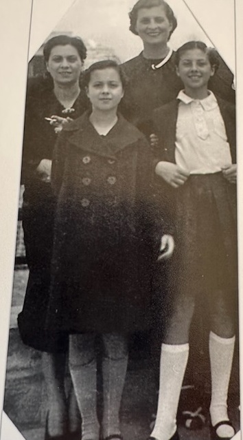 η Πηνελόπη αριστερά και η Αλίκη δεξιά με την θεία Μαργαρίτα (αδελφή της μητέρας τους) πίσω αριστερά και την Μαρούλα (μητέρα τους) πίσω δεξιά (πηγή: Μαρί Λουίζ Νικολαΐδη, κόρη της Αλίκης Περρωτή Κωνσταντοπούλου)