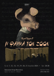 Στο έργο ο Orwell στηλιτεύει κάθε μορφή δικτατορίας : Σε ένα αγρόκτημα τα ζώα εξεγείρονται και ανατρέπουν τον άνθρωπο – αφέντη που τα καταδυναστεύει και δημιουργούν μια δική τους κοινωνία, όπου όλα τα ζώα είναι ίσα. Τη διοίκηση του κτήματος αναλαμβάνουν τα γουρούνια. Οι ελπίδες, όμως των ζώων για μια καλύτερη ζωή δεν πραγματοποιήθηκαν με την Εξέγερση. Τα ζώα εξακολουθούν να υποσιτίζονται, δουλεύουν σκληρά και ζουν υπό συνθήκες τυραννίας. Σήμερα, σχεδόν 80 χρόνια μετά, η προδοσία των ιδανικών, η διαφθορά, η κατάχρηση εξουσίας, η τυραννία του ολοκληρωτισμού, είναι όλα το ίδιο επίκαιρα όπως όταν γράφτηκε το βιβλίο. Οι παραστάσεις θα πραγματοποιηθούν: ΠΑΡΑΣΚΕΥΗ 5/4, ΣΑΒΒΑΤΟ 6/4, ΚΥΡΙΑΚΗ 7/4, ΠΑΡΑΣΚΕΥΗ 12/4, ΣΑΒΒΑΤΟ 13/4, ΚΥΡΙΑΚΗ 14/4, ΠΑΡΑΣΚΕΥΗ 19/4, ΣΑΒΒΑΤΟ 20/4, ΚΥΡΙΑΚΗ 21/4 ώρα έναρξης 20:30, στο Πολιτ/κό Κέντρο Μπενετάτου, Δρόση 2 και Δροσίνη, Ψυχικό, 15452 Είσοδος Ελεύθερη – Απαραίτητη η κράτηση θέσης στο τηλ 6973985951 Βασίλης Παπαπέτρου |
