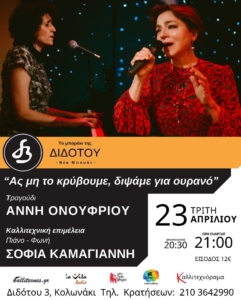 “Ας μην το κρύβουμε, διψάμε για ουρανό“ στο Μπαράκι της Διδότου Διδότου 3 – Κολωνάκι, τηλέφωνο κρατήσεων 210 3642990 Η Σοφία Καμαγιάννη αποφοίτησε από την Σχολή το 1989. Είναι συνθέτρια, μουσικός και παιδαγωγός. Τα μουσικά της ενδιαφέροντα καλύπτουν μια ευρεία γκάμα. Σπούδασε πιάνο, κλασικά κρουστά, σύγχρονη σύνθεση, μουσική για θέατρο και κινηματογράφο, καθώς και μαθηματικά στην Ελλάδα και την Αγγλία (μεταπτυχιακές σπουδές). |
