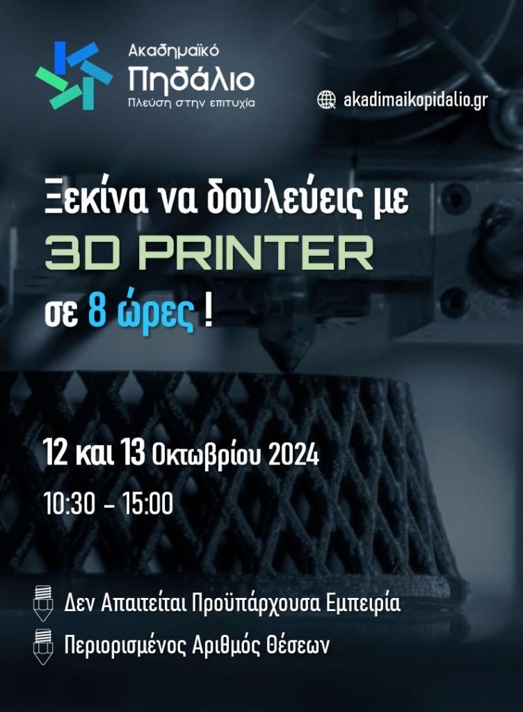 8ωρο σεμινάριο με θέμα τις τρισδιάστατες εκτυπώσεις θα λάβει χώρα στο ακαδημαϊκό φροντιστήριο «Ακαδημαϊκό Πηδάλιο» με διδάσκοντες τον Ρωμανό Οικονόμου και τον Αγησίλαο Κυριαζή. Τα θέματα που θα καλύψει το σεμινάριο ποικίλουν και αρκούν για την εισαγωγή του μετέχοντα στην επιστήμη της 3d εκτύπωσης. Το σεμινάριο κοστίζει συνολικά 150€ και η πλατφόρμα συμμετοχής επισυνάπτεται παρακάτω. Ακαδημαϊκό Πηδάλιο: Πειραιάς, Κολοκοτρώνη 102-104, 1ος όροφος)