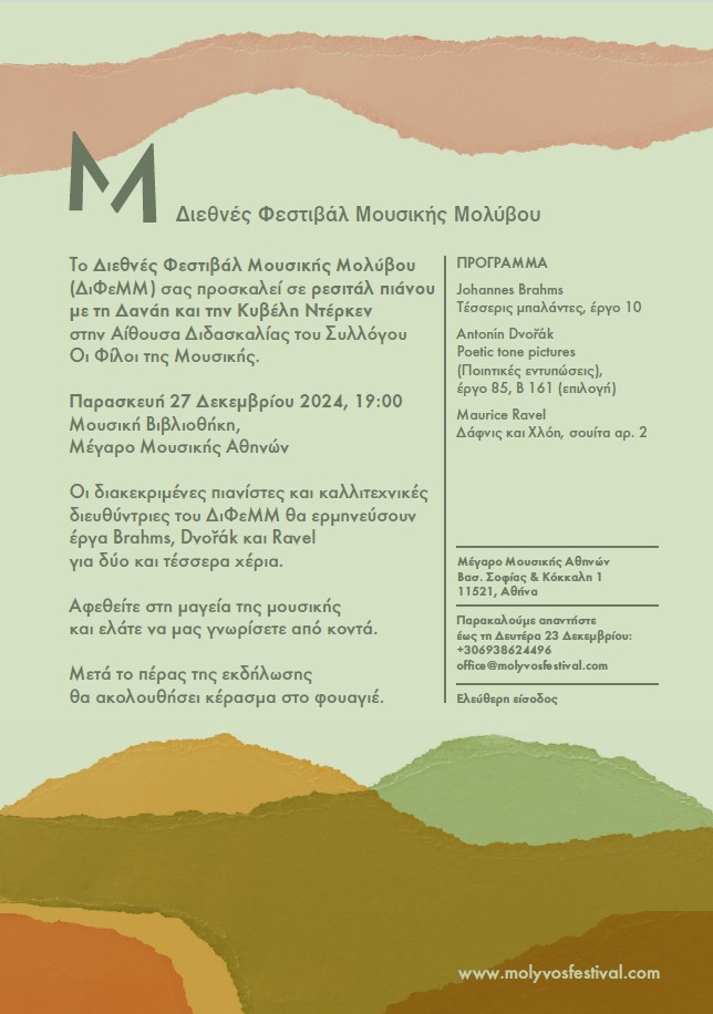 Οι διακεκριμένες πιανίστες και καλλιτεχνικές διευθύντριες του ΔιΦεΜΜ Δανάη και Κυβέλη Ντέρκεν δίνουν στο Μέγαρο ένα ξεχωριστό ρεσιτάλ, όπου οι διακεκριμένες πιανίστες και καλλιτεχνικές διευθύντριες του ΔιΦεΜΜ θα ερμηνεύσουν έργα Βrahms, Dvorák και Ravel για δύο και τέσσερα χέρια. Η συναυλία θα πραγματοποιηθεί την Παρασκευή 27 Δεκεμβρίου 2024, στις 19:00, στην Αίθουσα Διδασκαλίας της Μουσικής Βιβλιοθήκης «Λίλιαν Βουδούρη» του Συλλόγου Οι Φίλοι της Μουσικής. Η είσοδος είναι ελεύθερη. (περισσότερα…) |