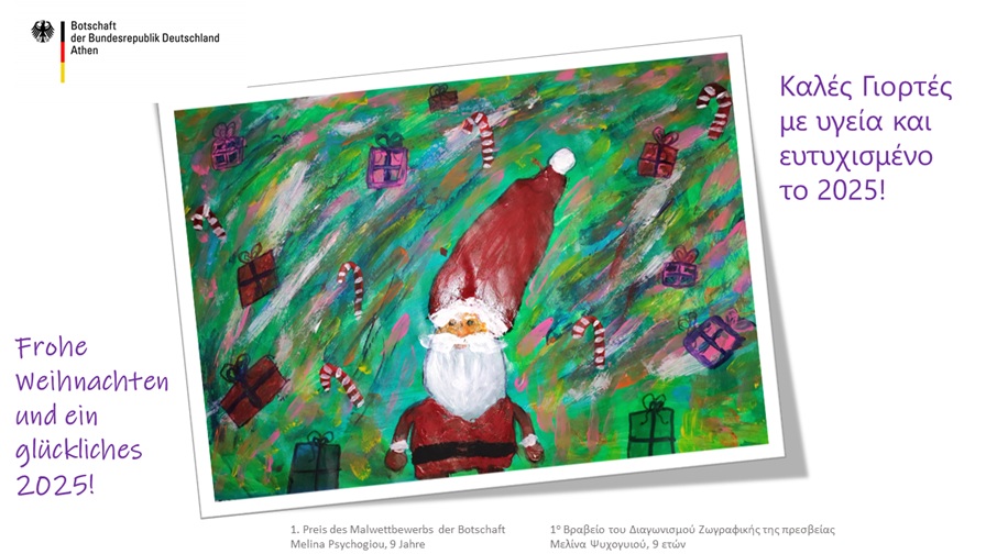 Η Πρεσβεία της Γερμανίας μας εύχεται “Καλά Χριστούγεννα” με την Χριστουγεννιάτικη Κάρτα, της 9-χρονης Μελίνας Ψυχογιού, που κέρδισε το πρώτο βραβείο στον Διαγωνισμό Ζωγραφικής της εφετινής χρονιάς. |